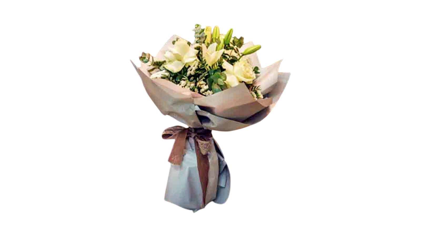Buket je napravljen od belih holandskih ruža i belim ljiljanom i dekoracijom.